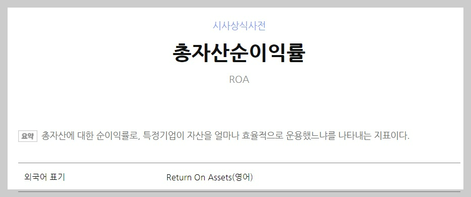 ROA는 부채까지 모두 포함한 총자산 순이익률이다.
